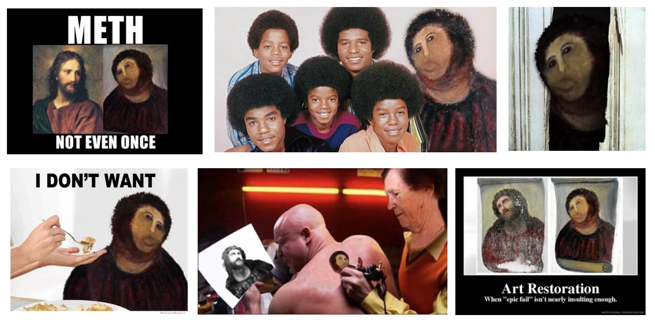 Antes de adentrarnos en los argumentos por los que afirmamos que la fallida restauración sobre una pintura decimonónica es una obra de arte, queremos poner en contexto los hechos que llevaron al Ecce Hommo de Borja a ser el objeto de un fenómeno global como se describe desde el portal KnowYourMeme8